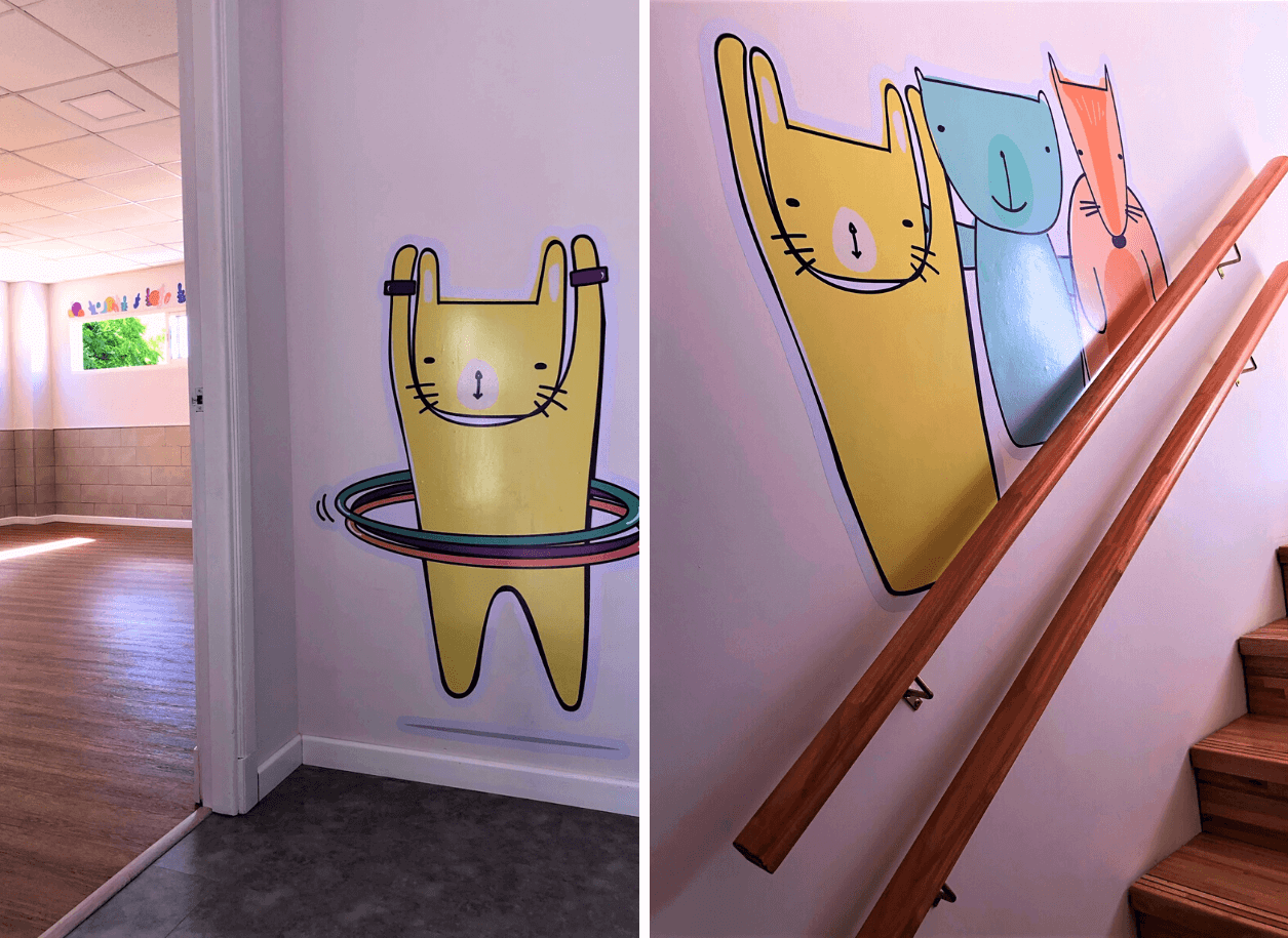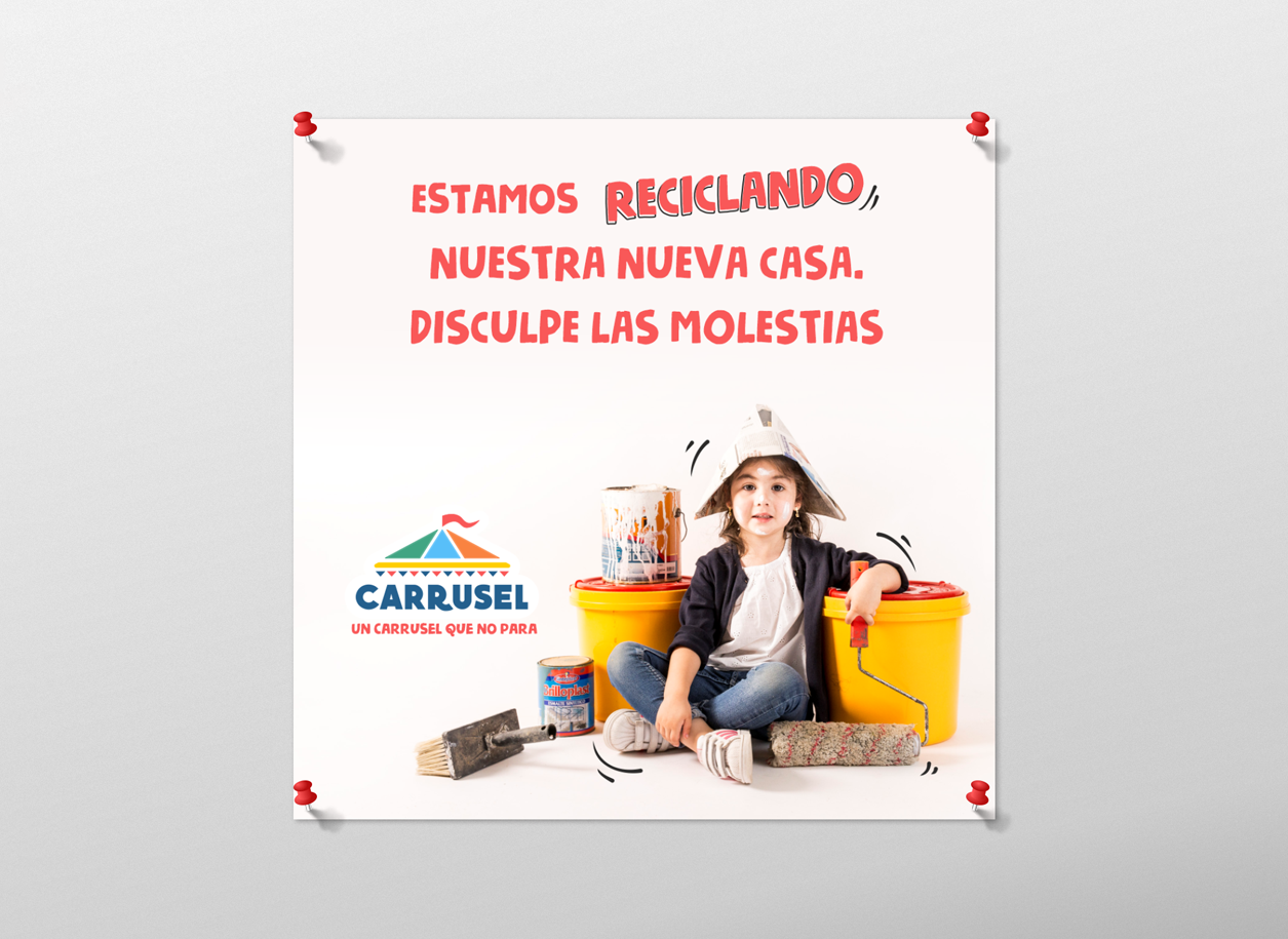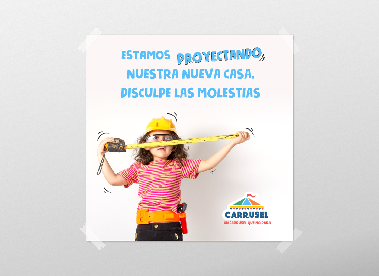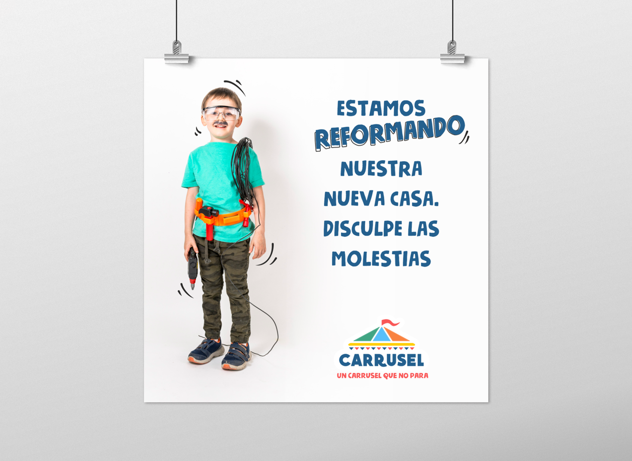 Trabajo realizado para el nuevo local de Jardín de Infantes Carrusel que incluyó: actualización del logotipo, campaña en redes sobre la reforma del edificio, diseño de cartelería para la fachada y diseños para todos los salones, pasillos y corredores.